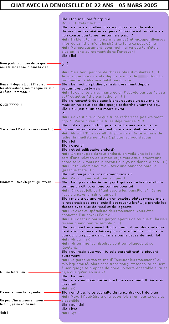 y’en a une autre qui vivait avec qq’un etqui venait sur le site uniquement pour discuter le midi avec des gens, et je vous en passe des cas comme ça, après meetic fais style ‘nous on censure les annonces pour assurer la qualité sur notre site’, j’aimerais bien voir la tête des censeurs car lorsqu’on regarde les annonces il y’a quoi de se poser des questions…vous trouvez normal qu’une annonce de ce style puisse passer la charte qualité ??