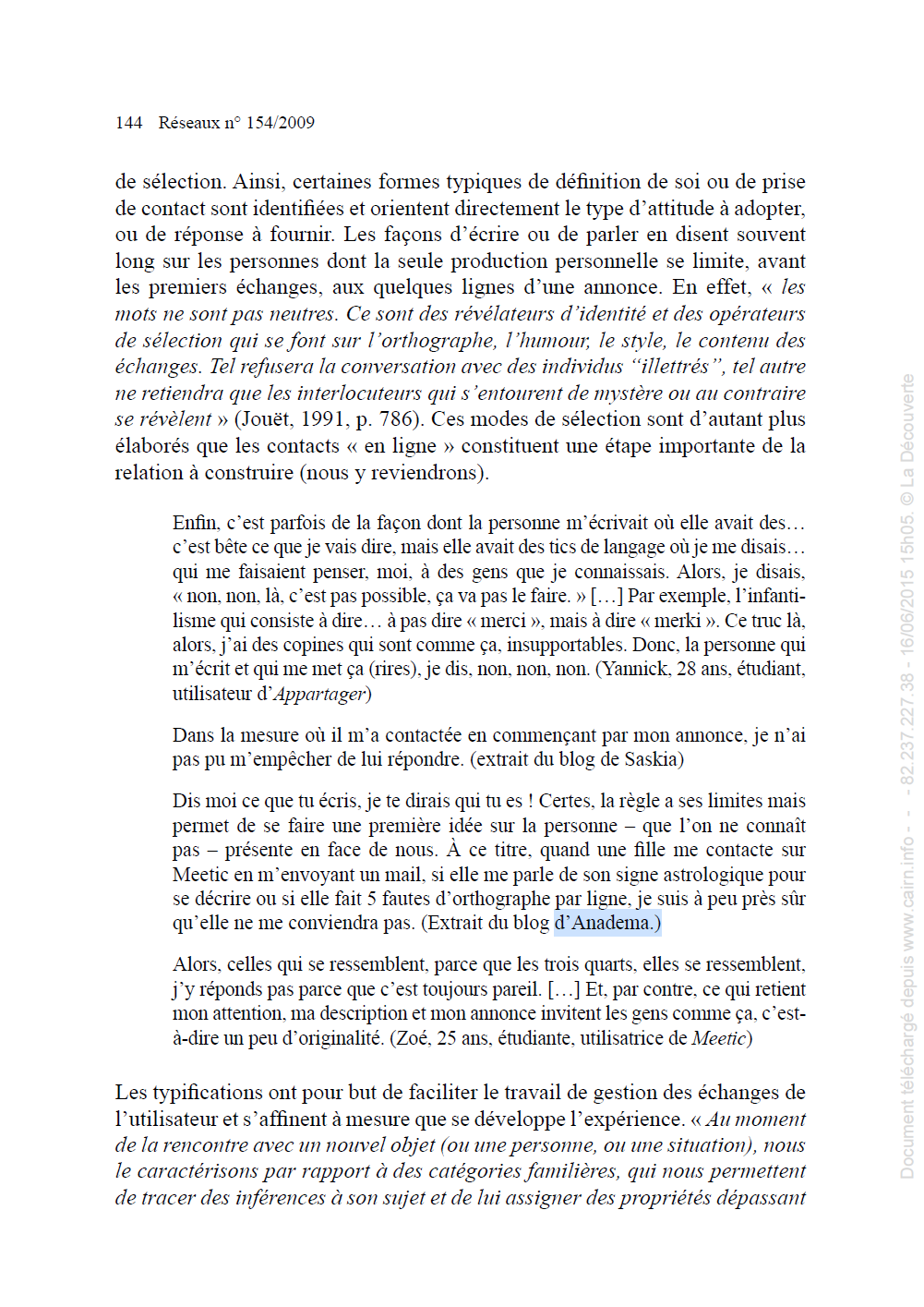 Dans Sélection, appariement et modes d’engagement dans les sites de mise en relation – Johann Chaulet